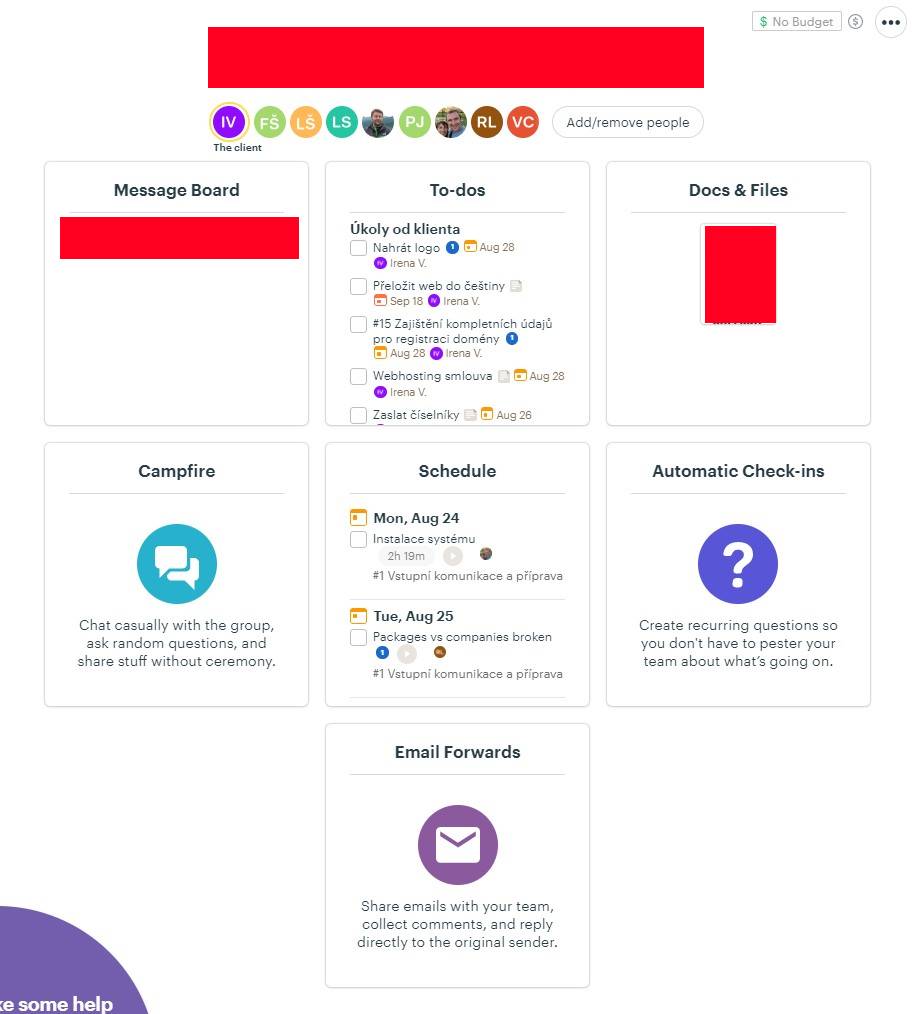 Hlavní obrazovka projektu v Basecamp s plnými možnostmi