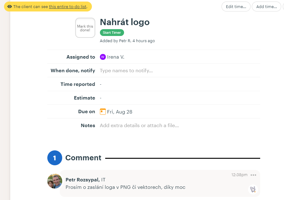 Stává se nám poměrně často u nových klientů. V Basecampu fakticky neexistuje nic jako zadavatel, který má právo veta. Ten, kdo založí nějaký nový úkol, by jej měl také na konci uzavřít. Vezměte si příklad na obyčejném logu. ,,Zadavatel“ je v tomto případě agentura, která klientovi zadá, aby poslal logo. To nejprve nemusí vůbec dorazit v odpovídajícím formátu (neprůhledný JPG formát, nedostatečná velikost apod). Po několika kolečkách, kdy si úkol přehazují obě strany navzájem jako úkol, pak klient po zaslání správného loga úkol ukončí. Ale zadavatel takové logo chce ještě umístit na web – pokud je úkol ukončen předčasně, naruší se „řetěz“ a drahocenný čas se pak plýtvá na dohledávání materiálů. A někdy si chce zadavatel (ať je z jakékoliv strany projektu) splnění zadání před dokončením ještě zkontrolovat.