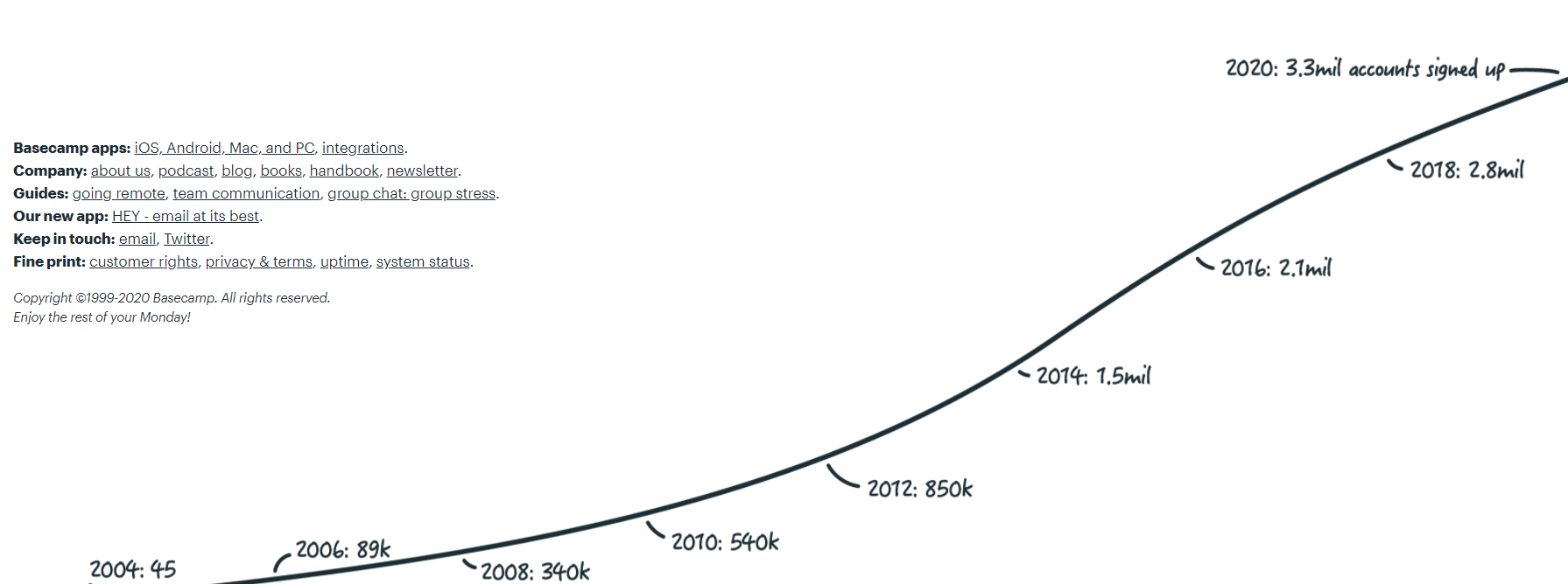 Basecamp původně vznikl jako interní nástroj americké online agentury 37signals pro účely interní organizace práce. To se psal rok 2004. Díky následnému vývoji a v té době poměrně inovativnímu systému práce se z Basecampu stal, i díky virálnímu šíření, produkt určený pro veřejnost. Byl natolik úspěšný, že firma přestala dělat klasickou agenturní a konzultační činnost, a začala se Basecampu věnovat naplno. V roce 2006 do společnosti zainvestovat jistý Jeff Bezos – který má opravdu dobrý čich na skvělé firmy – a který je díky založení a vlastnictví Amazonu aktuálně nejbohatším člověkem na planetě (rok 2020).