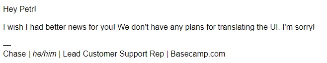 BaseCamp má i některé nedostatky. Největším je absence jiného jazyka, než je angličtina. Chápeme, že se jedná o aplikaci založenou v USA, samozřejmě. Na druhou stranu přiznáváme, že díky tomu není BaseCamp použitelný úplně pro každého. Přece jen, kompletní prostředí v českém jazyce by systému velmi slušelo a věřím, že by se našla spousta jedinců, kteří by těch pár stovek frází byli schopni přeložit do svého jazyka i zdarma. Bohužel, v této době nic takového není možné. Dalším neduhem může být pro někoho absence dílčích funkcí, například měření času nad projekty nebo doplňky řešící konkrétní styly práce (Kanban plachta a mnoho dalšího). Toto vše se dá ovšem do Basecampu integrovat za pár minut díky zmíněným rozšířením.