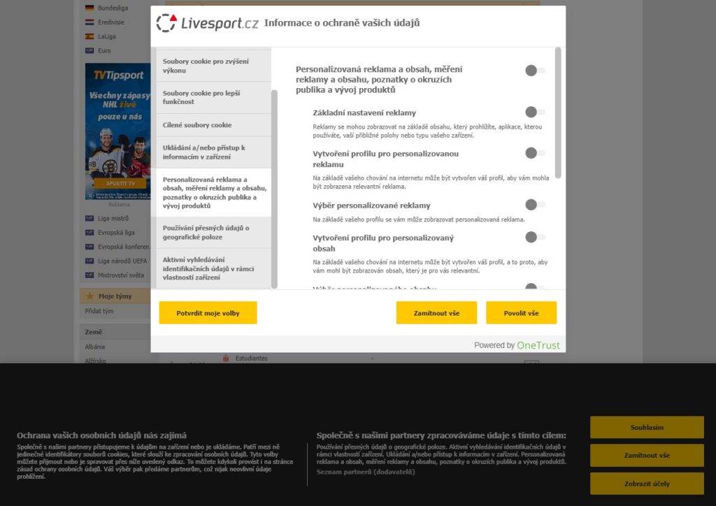 Typická cookies lišta může od ledna 2022 vypadat podobně, jako na webu livesport.cz.