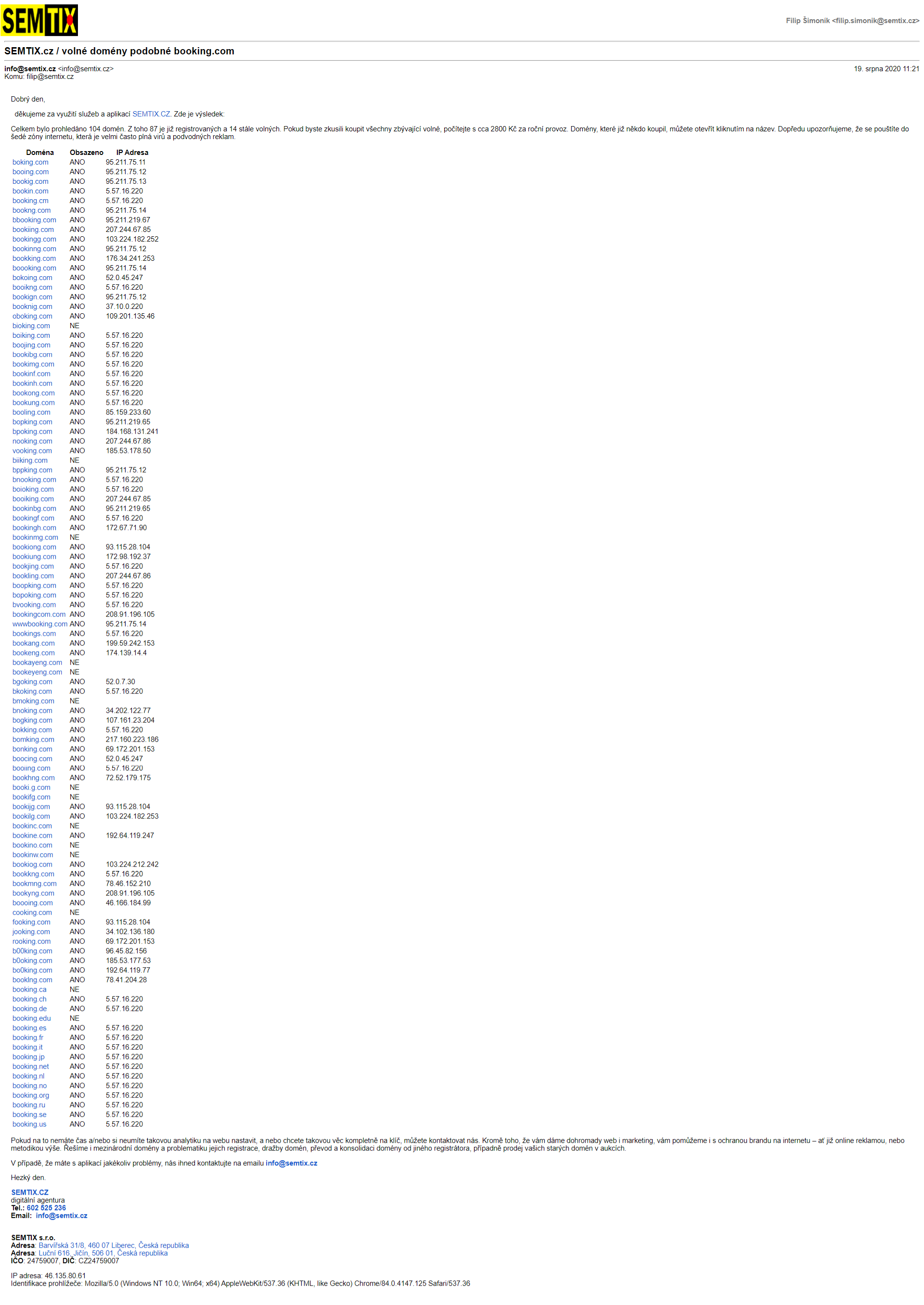 Chcete vědět, jak dopadnete, pokud toto nebudete řešit s předstihem? Dopadnete jako Booking.com, Heureka, Alza a desítky dalších. Pod odkazy můžete totiž vidět aktuální seznamy domén, které krouží okolo velkých značek, a velmi často jsou skoupené spekulanty, kteří domény koupili dříve než velké značky – a ty je pak zpětně vykupují za nekřesťanské peníze, protože se jim to i tak často vyplatí. Některé z domén stihly zakoupit původní firmy včas, velká část z nich ale míří na podvodné reklamy, je přesměrovaná na jiné (konkurenční) weby, část je stále k registraci. A v současné době je to boj na poli expirovaných domén (někdo tzv. odchytí doménu, kterou někdo zapomněl prodloužit a zaplatit) a soudních síní (někomu došla trpělivost).