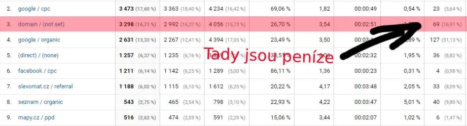 Jedná se o screenshot z Google Analytics účtu firmy, která trpí právě nejednoznačným názvem. Z logických důvodů a s ohledem na čísla budeme diskrétní. Zdroj návštěvnosti ,,domain“ jsou nakoupené domény, které má firma přesměrované na hlavní web. Používá je jako zdroj návštěvnosti a objednávek. Má je nastavené tak, aby se dala měřit návštěvnost a výkonnost domén. 3298 je počet návštěv za 1 měsíc provozu. A číslo 69 je pak počet konverzí (rozumějte objednávek) za jediný měsíc. Mohu vás ujistit, že příjem rozhodně překonává pár stovek korun za nakoupené domény.