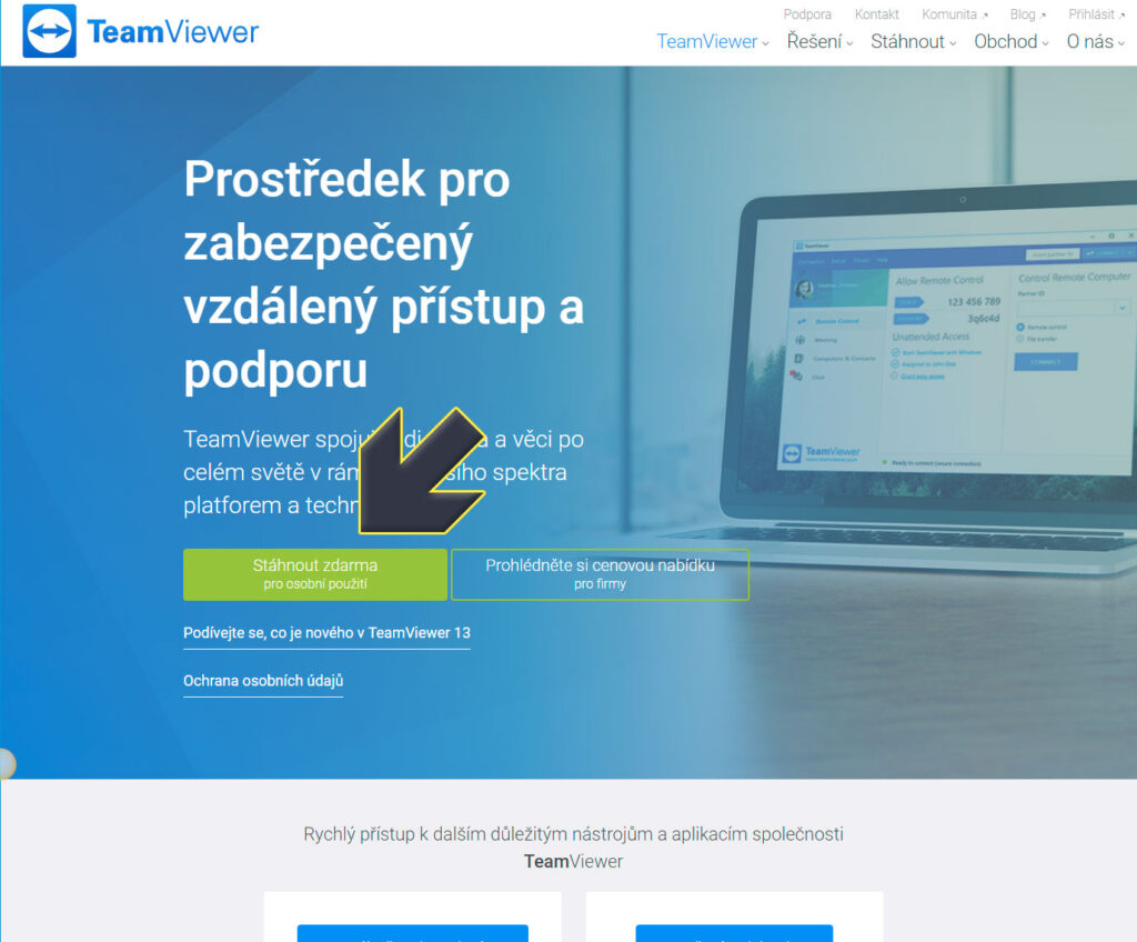 Přejděte na stránku https://www.teamviewer.com/cs/ a klikněte na zelenou ikonu pro stažení programu. Program má i českou verzi