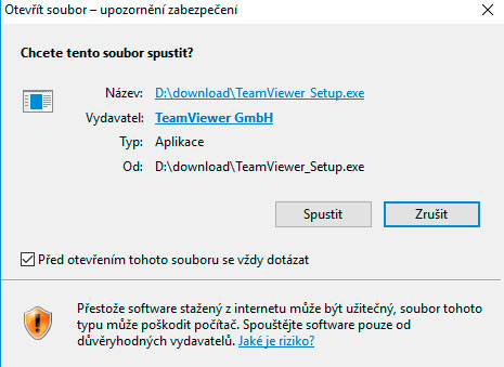 Po stažení souboru se buď instalace rovnou spustí, nebo se stažený soubor objeví v prohlížeči a je nutné na soubor kliknout (například v Chrome se objeví v levém spodním rohu). Po spuštění se vás počítač zeptá, zda chcete opravdu program spustit, klikněte na Spustit (Windows 10, jiné operační systémy mohou mít drobné odlišnosti).