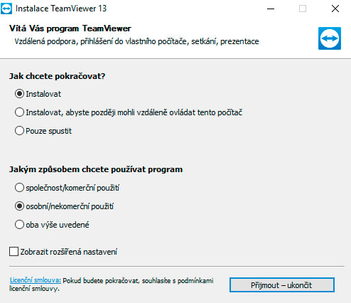 Pokud se během instalace objeví další hlášky / požadavky a bezpečnostní potvrzení, jednoduše vše potvrďte a odsouhlaste, než se objeví nastavení Teamvieweru:
