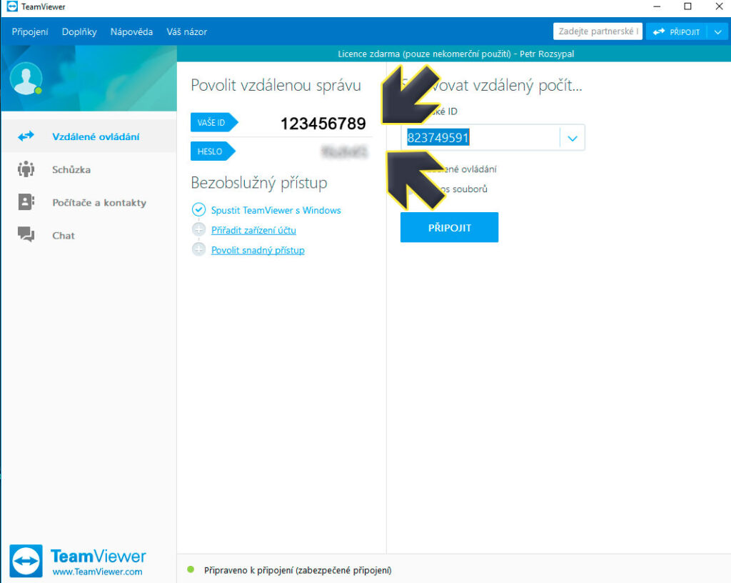 Na obrázku výše vidíte 2 šipky které směřují na Vaše ID a heslo. Tyto 2 věci zkopírujte, a pošlete tomu, kdo má s vaším PC (dočasně) pracovat. Pro upřesnění dodávám, že pokud máte program nainstalovaný dočasně / nově a nemáte u Teamviewer registraci, po opětovném spuštění či restartu PC se vaše heslo pokaždé změní. Heslo pro dočasný přístup tedy posílejte těsně předtím, než bude s PC dotyčný vzdáleně pracovat, nebo nechte PC celou dobu puštěné. Vyhnete se tak trapným debatám o tom, proč přístup přes Teamviewer nefunguje.