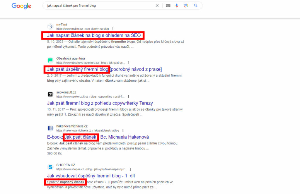 Nadpis článku by měl vyjadřovat,o čem článek skutečně je. Měl by být poutavý a můžete do něj zkusit vhodně zakomponovat i dobře hledanou frázi. Titulek je 50 % úspěchu. Představte si, jak člověk sedí před počítačem, dívá se na výsledky vyhledávání a přemýšlí, na co klikne. Co ho zaujalo? Přesná fráze, nebo číslovka, nějaký znak, neformální či vtipný text, výhodná nabídka, nebo ho text celkově ohromil, zaujal, vzbudil zvědavost či oslovil z jiného důvodu? Lidé o vašich titulcích a popiscích hlasují kliknutím myší, a tím rozhodují o úspěchu, nebo naopak neúspěchu.