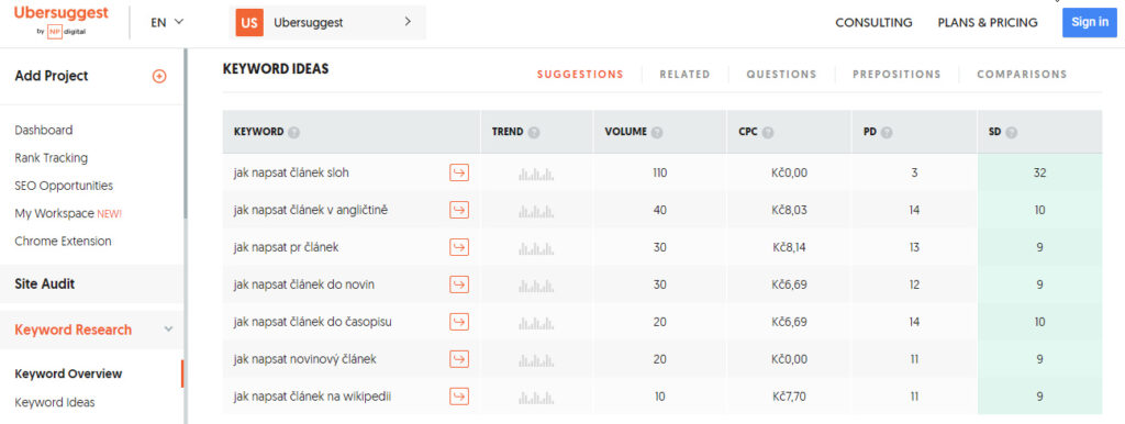 Obdobnou funkcionalitu má i Seznam. Užitečné mohou být našeptávače vyhledávačů, statistiky hledání na Seznamu nebo bezplatný nástroj Ubersuggest.