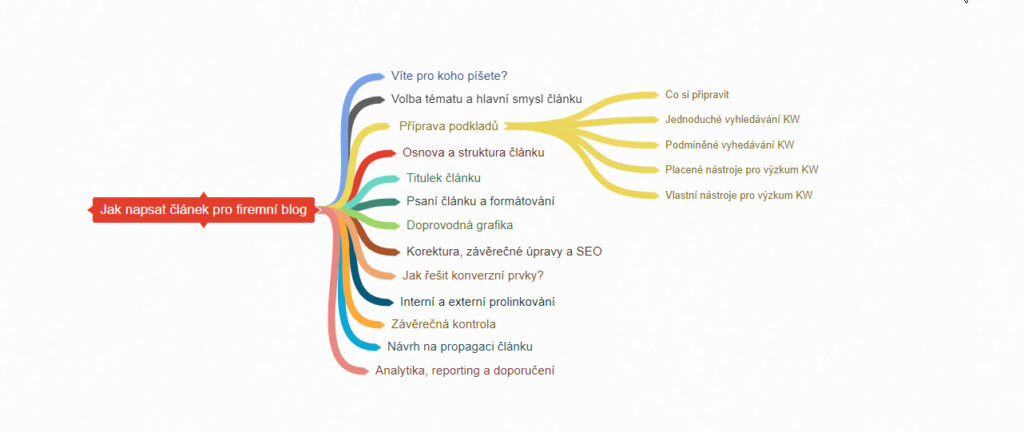 Před zahájením práce na článku je nutné vytvořit jeho obsahovou osnovu a při psaní se jí držet. Někdy se stane, že se autor rozepíše a článek je nakonec o něčem úplně jiném. Stručný obsah v bodech by měl pomoci udržet myšlenky, nezapomenout na nic důležitého a rozložit informace v jednotlivých odstavcích v rozumném poměru. U rozsáhlejších a náročnějších článků, kde chceme udělat rozsáhlejší SEO, si vytvářím strukturu článku a mezinadpisy třeba v excelu. Nebo si vytvořím rovnou myšlenkovou mapu. U nás pracujeme například s programem Coogle, který používáme i při tvorbě webů. Jeho výhodou je možnost sdílení myšlenkové mapy v týmu a společná práce na projektu. Nezapomeňte si udělat představu, jak bude článek rozvržen z hlediska textu, grafiky, multimediálních souborů, citací atd.