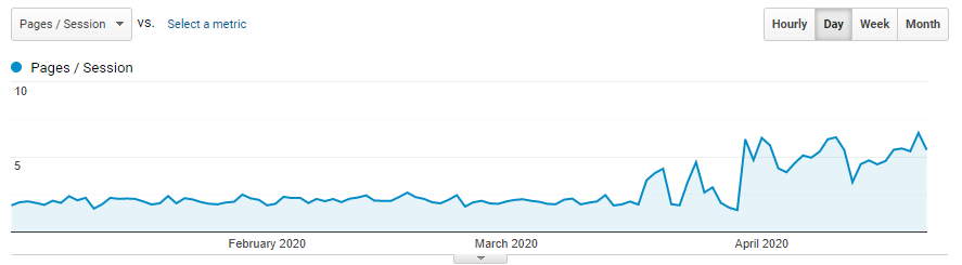 To je zase chování zákazníka, o které na webu opravdu stojíte. Čím delší doba strávená na stránce, tím více vaše nabídka návštěvfníky zajímá. Je to v podstatě protihodnota Bounce-rate, tyto 2 metriky na sebe mají přímý vliv. Tuto metriku se nám povedlo z 1:30 zvednout na současný průměr 4:15, tedy téměř 3x více.