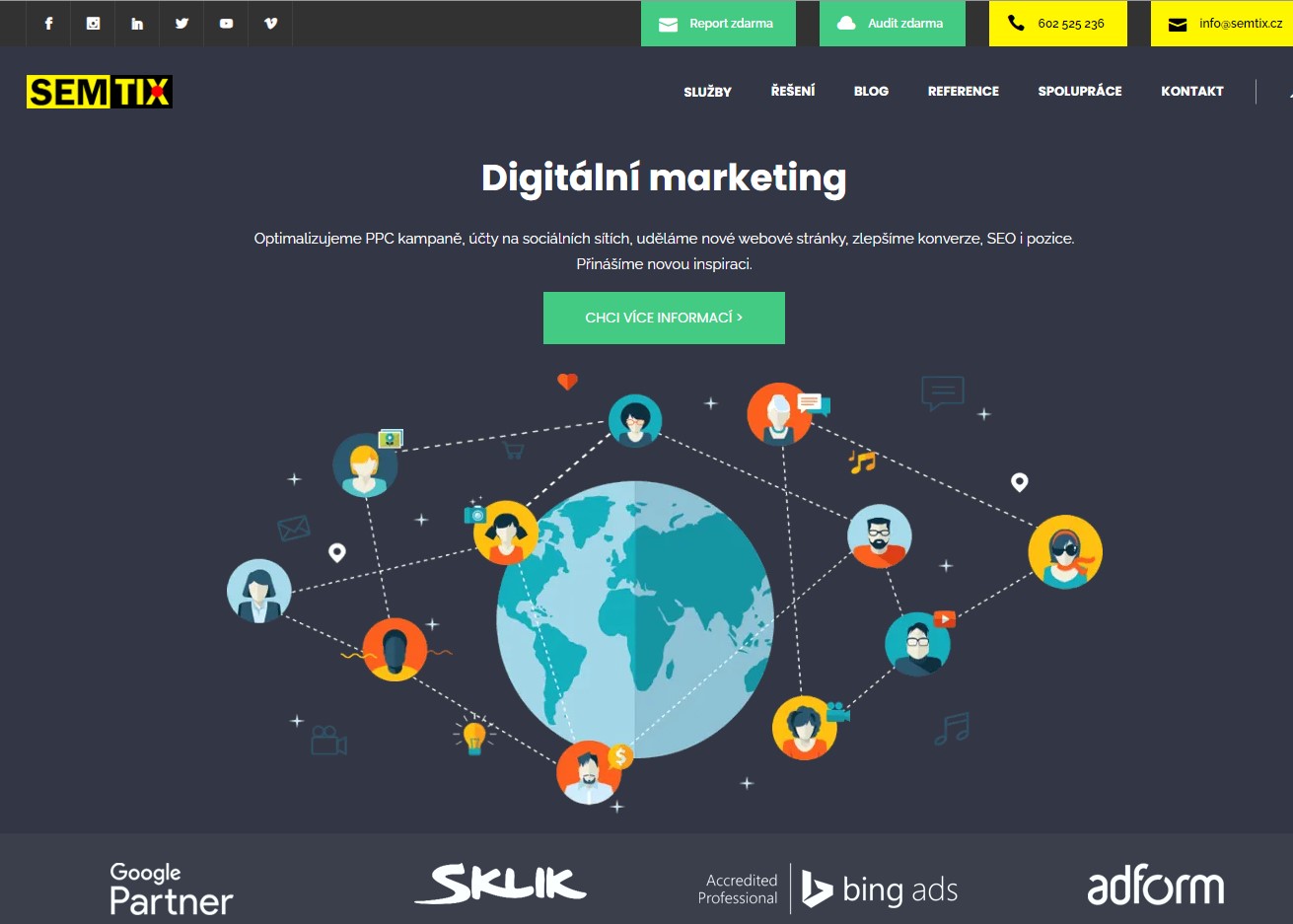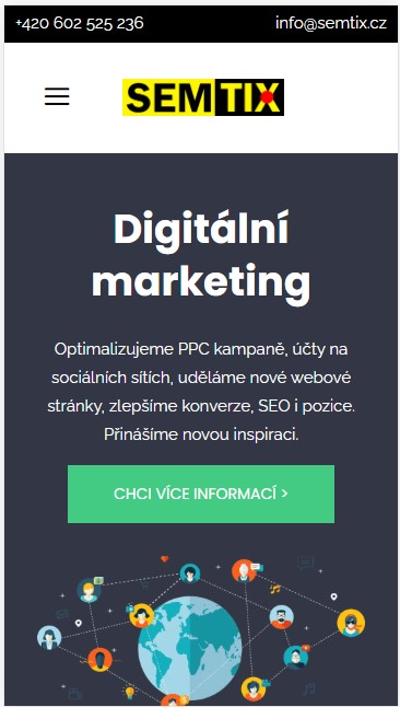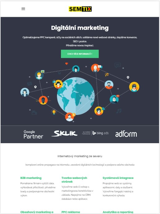 Jednoduché vytvoření grafického návrhu webu má několik velkých ALE. Největší problém je spojen s faktem, že s velkou pravděpodobností budou na Váš web chodit lidi prostřednictvím mobilních zařízení. Vyhledávání na internetu v ČR už dávno ovládly mobilní telefony. V případě profesionálního grafického návrhu si s verzí pro PC už nevystačíte. Lidé přicházejí z mobilního telefonu, televize, tabletu (na výšku, na šířku) i z dalších zařízení. Díky tomu se grafický vývoj webů stal násobně složitější. Jako příklad designu poslouží náš web SEMTIX.cz – fakticky se jedná o 3 různé grafické návrhy (a ten mobilní je i pro nás nejvíce důležitý):