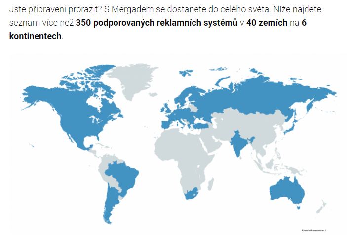 Další nespornou výhodou je počet podporovaných zemí. Zkuste se schválně podívat na počet druhů feedů, které systém umí. Potom si nechte od svého webového vývojáře nacenit cca 300 druhů feedů, které by měl eshop umět poskytnout. Samozřejmě s vědomím, že neustále dochází ke změnám a doplněním, které různé platformy v čas provádějí. Bez Mergada v podstatě nemožné, respektive ekonomicky nerentabilní.