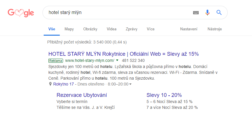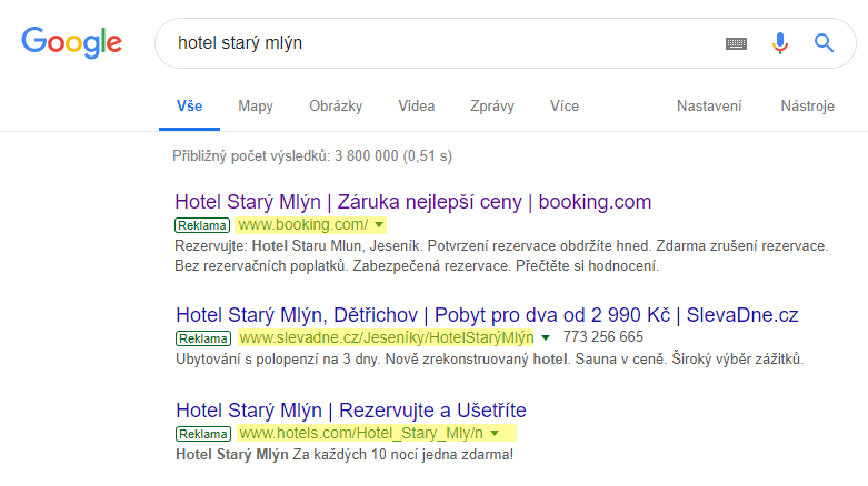 Hotel Starý Mlýn je typická rodinná klasika. Super služby, zaměřené na přesně definovanou klientelu, a výsledkem je 70-ti procentní návratnost hostů. O věrné zákazníky má hotel postaráno, a tak to má být. Jenže i tady hrozí ubytovateli nebezpečí. Problémem je zejména způsob, jakým lidé hledají hotel při opětovném kontaktu. Většina z nich jde klasickou nejrychlejší cestou přes vyhledávače. Ať už z důvodu nedostatku času, stereotypu jakým běžně hledají, nepozornosti, či některého z řady dalších důvodů. Prostě jdou na Google / Seznam, zadají název hotelu a … hotel si rezervují. Všimnete si “drobného problému“, pokud si chci jako klient objednat ubytování přímo od pana Krejčího v Hotelu Starý Mlýn?
