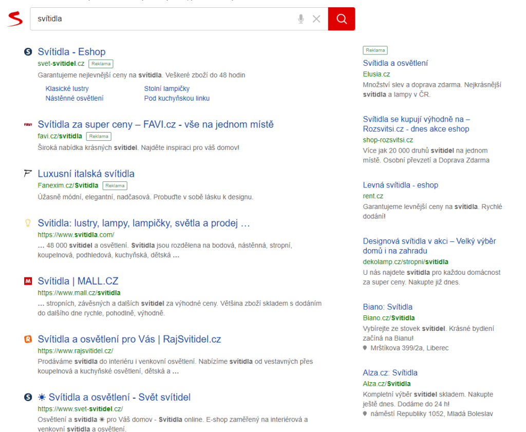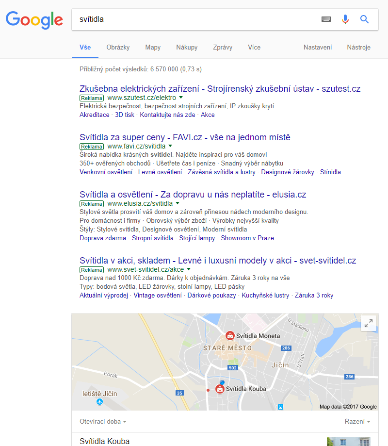Dále, vezměte si libovolnou frázi ve svém městě, například ,,svítidla”, výsledek na Googlu bude pak vypadat takto: