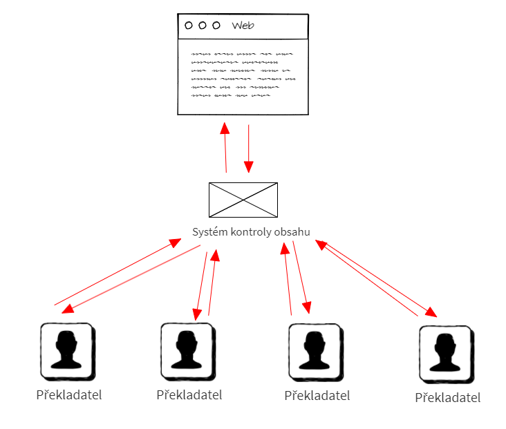 Důležitý fakt znázorněný na obrázku výše ukazuje, že překladatelé překládají celou webovou stránku (nebo jen její část) v kontextu celého webu, a především se zachováním všech interaktivních prvků webu, které musel programátor složitě vytvářet. Překladatel dostane text, který obsahuje technické značky webu (HTML kód, další specifické prvky) a přeloží v něm pouze to, co se má přeložit (text na tlačítku, odstavec textu, popisek obrázku a další). Po překladu text projde korekturou a vrátí se automaticky do systému. Systém překlad přebere a upraví jazykovou mutaci dané stránky. Až na ruční překlad probíhá vše automaticky, na pozadí, bez zapojení majitele, administrátora webu nebo programátora. Díky automatizaci odpadá zbytečná komunikace, drtivá většina programování a nejrůznější formátování. My jsme aktuálně na cca 10 % času stráveného nad úpravou jazykových verzí webu oproti starému řešení. A tuto výhodu přenášíme cenově na své zákazníky.