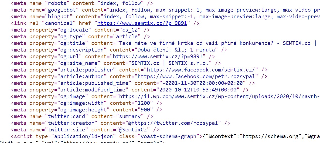 - HTML kód – neboli jazyk, který vypisuje obsah stránky (nadpisy, texty, odstavce, odkazy)