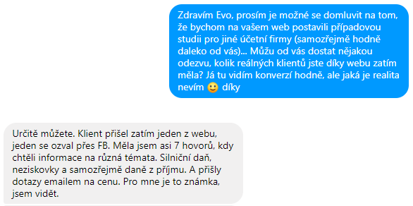 Ihned po dokončení webu jsme přešli k lokálnímu internetovému marketingu. Paní Eva má nyní nastavených 5 různých druhů reklamních kampaní. Jde o kombinaci přístupů, kdy každá z kampaní slouží k zachycení zájmu potencionálního klienta v různé fázi rozhodovacího cyklu podle koncepu STDC (See-Think-Do-Care). Výsledky kampaní průběžně vylepšujeme, nicméně již teď je jasné, že internetový marketing měl pro účetní firmu opravdu smysl. Během přibližně 2-měsíční kampaně jsme prostřednictvím webu zajistili 32 konverzí (telefonní hovory, emaily, vyplněné formuláře). S průměrnou cenou 197 Kč za 1 poptávku. Troufáme si už ze zkušenosti odhadnout, že cena za jednu konverzi bude nadále klesat až k hodnotě 100 Kč. Abychom se nedrželi pouze čísel, která mohou být neosobní a často i nepřesná. Zeptali jsme se přímo u zdroje. Dotaz po prvním měsíci fungování kampaní, který byl výsledkově logicky nejhorší :