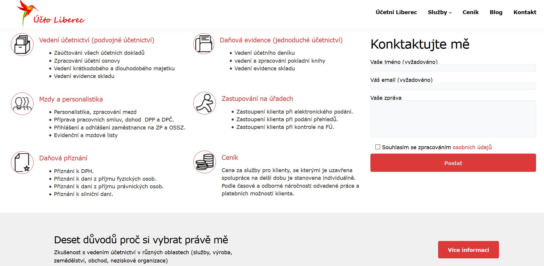 Mezi našimi klienty jsou i malé firmy, živnostníci a řemeslníci. Na počátku roku 2019 jsme vytvořili jednoduché webové stránky pro libereckou účetní, paní Evu Velechovskou. K tomu si dovolím poznámku. Pokud potřebujete spolehlivou účetní, pokud vám chybí odpovědný člověk, který by bravurně zvládal externí účetnictví, doporučuji paní Evu. Je zvyklá i na klienty co si dělají domácí účetnictví v excelu. Než by připustila problém s finančním úřadem, raději vám před uzávěrkou zavolá i v sobotu večer. Dokáže vést účetnictví v Liberci, stejně jako v jiných městech díky moderním komunikačním prostředkům a dálkovému přístupu …